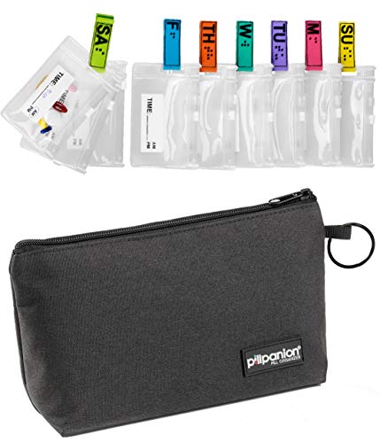 • Complete pillpanion kit includes one lockable zipper case (lock not included), one day tab for each day of the week, 21 zipper pouches and a handy medication chart to list medications and phone numbers; Add additional pouches with our refills if you need more than three pouches per day.